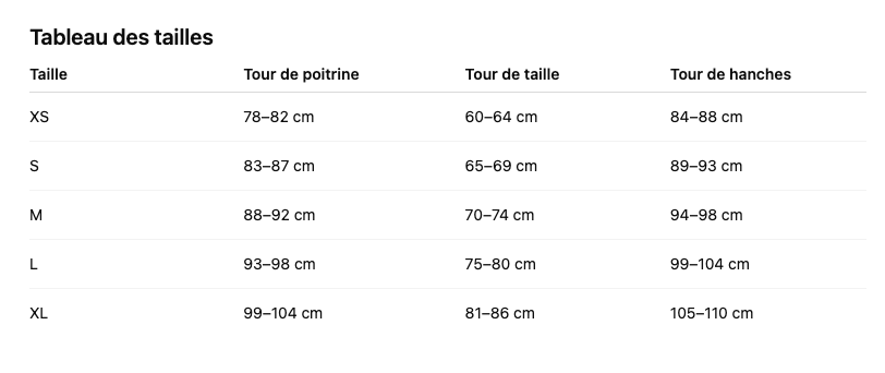 Si tu hésites entre deux tailles, prends la plus grande pour plus de confort.
